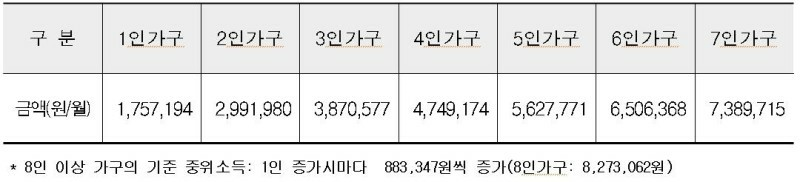 2020년 중위소득표 기준 100% 이하의 소득인 경우 신청 대상이며, 기준은 아래와 같습니다.